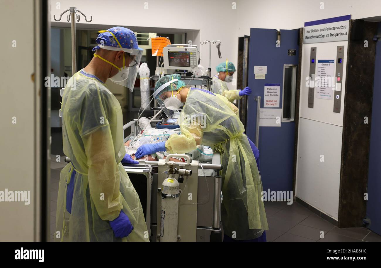 Medical Staff Transfer A Patient In Need Of An Ecmo Extracorporeal Membrane Oxygenation Life Support Unit For A Ct Examination At The Coronavirus Disease Covid 19 Intensive Care Unit Icu Of The Klinikum